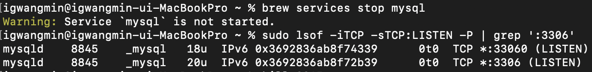 그 말은 brew에서 즉 Local에서 동작중인 MySQL이 죽지 않고 돌고 있다는 것을 의미합니다. 아래와 같은 오류도 볼 수 있죠
